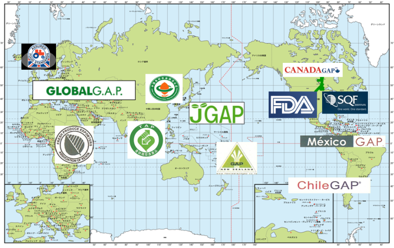 その他GAP:日本国内各都道府県自治体独自GAPや生協GAP、世界各国(アメリカ、ヨーロッパ、東アジア、アフリカ、オーストラリアなど)で独自のGAP認証制度が多数ある。